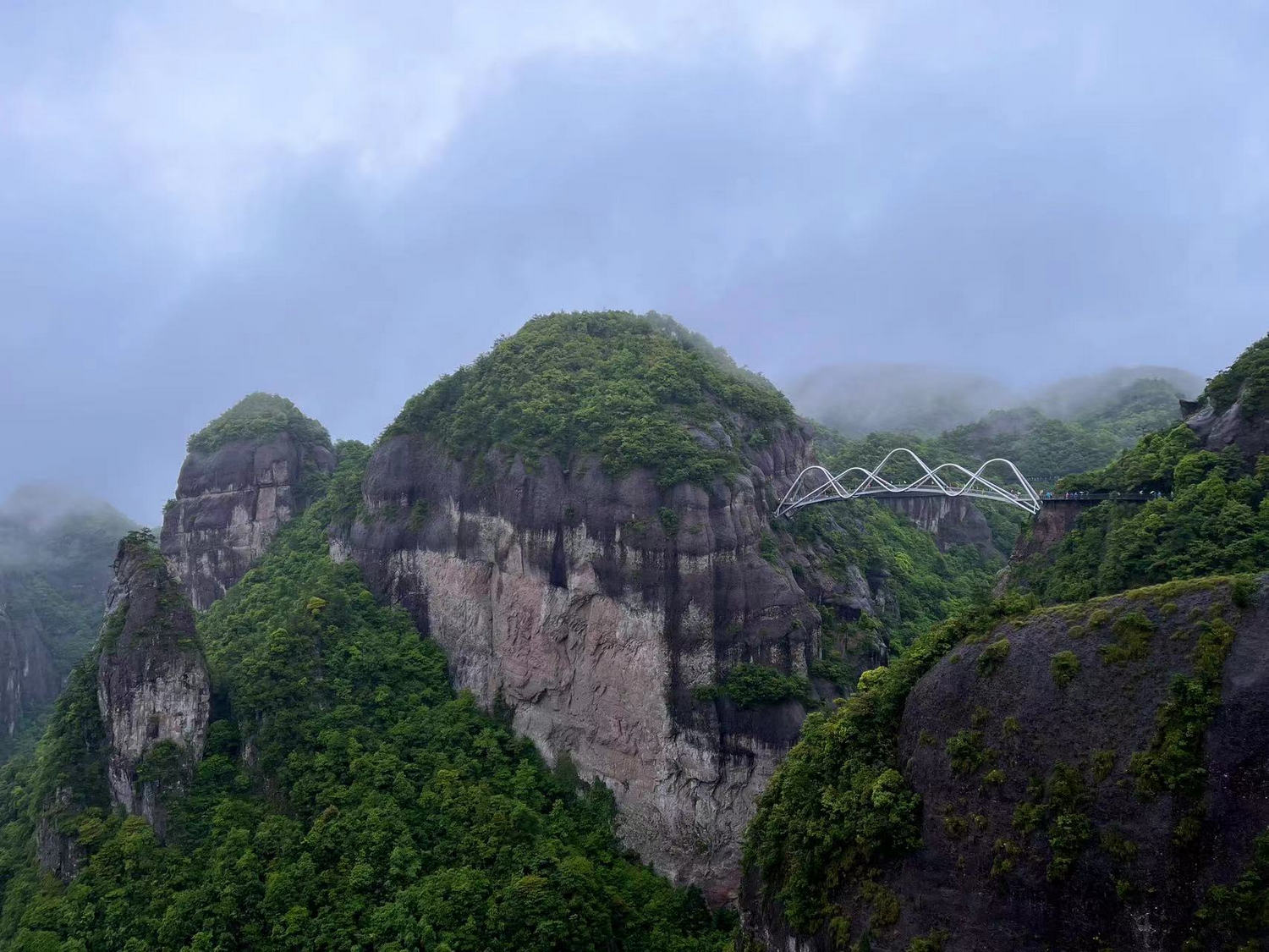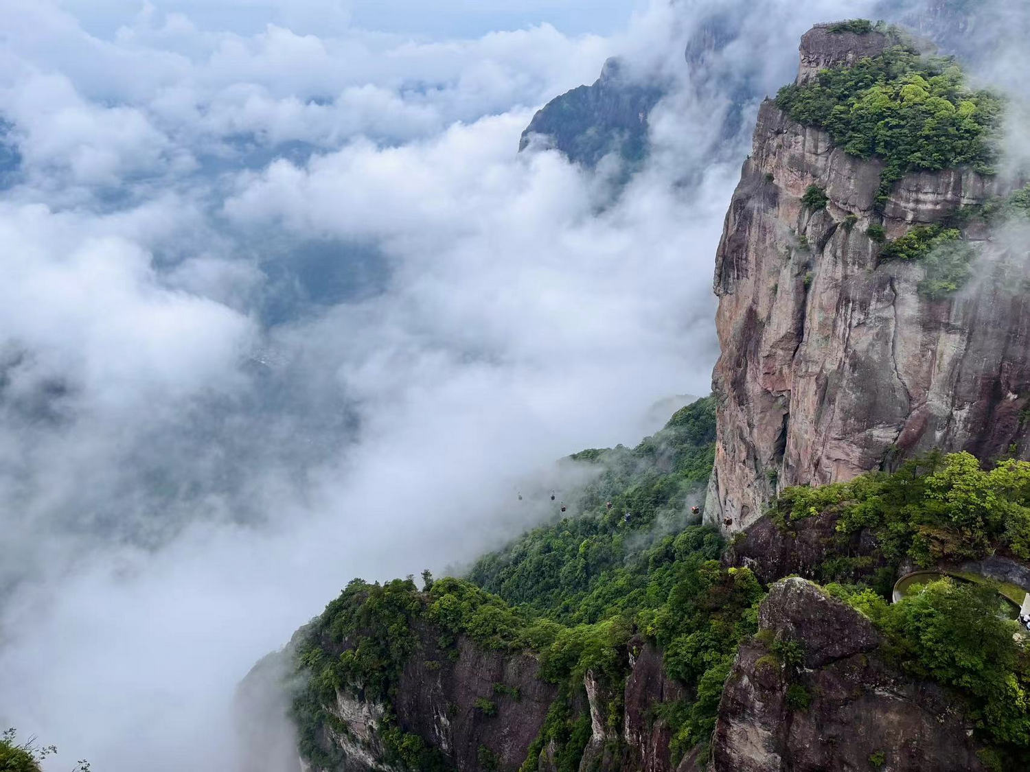 從南天索道上去,自北海索道下來,數公(gōng)裏的(de)旅程均在數百米高的(de)棧(zhàn)道上進行。其間依次行走在菩提道(dào)、般(bān)若道、因緣道、觀音道、飛鷹道與無為道這六條道上。途中鳥鳴婉(wǎn)轉,移步換景,如置(zhì)身畫卷之中行走,雖有陡(dǒu)坡亦不足道哉。景區內負氧離子含量奇高,平均達2.1萬個/每立方厘米,最高處達8.8萬個/每立方厘米,是名副其實的天然氧吧。得閑即是仙,行走其間,尋(xún)心朝聖,觀得本心,自在愉悅。